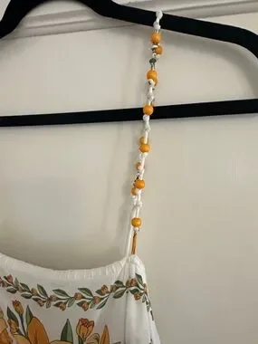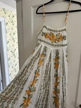 Lightweight FARM Rio maxi dress. White base with vertical yellow floral stripes and green leaves. Spaghetti straps with beaded detail. Flowing A-line skirt. Vibrant, tropical print.