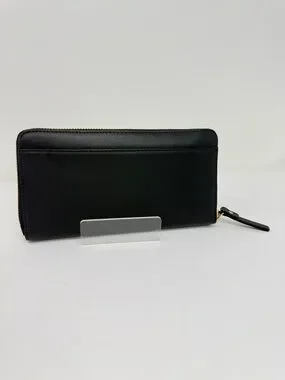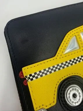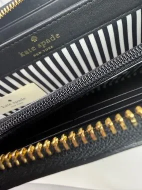 Full size long zip-around wallet by kate spade featuring the New York City iconic taxi cab. Black exterior with gold-tone zipper. Interior features black and white library striped lining. Sleek logo stamping inside.