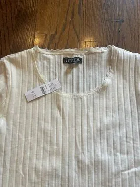 J. Crew short-sleeve tee in cream. Ribbed texture with subtle vertical stripes. Soft, lightweight knit for easy layering. Simple round neckline with slight scalloped edge. Versatile piece for casual outfits.
