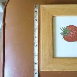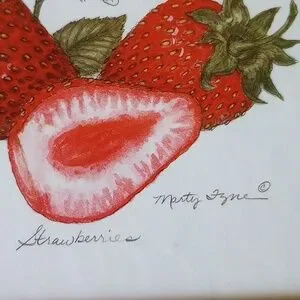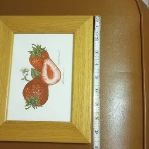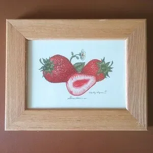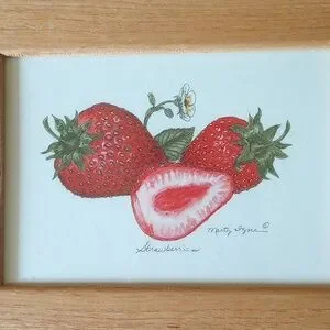 Vintage "Strawberries" art print by Marty Zyne. Red, green, white, and yellow. Oak wood wall frame with glass. Overall dimensions 9.5 x 7.7 inches. Sawtooth hanger on back. Very good condition. Please check out my MANY other strawberry listings!