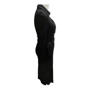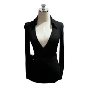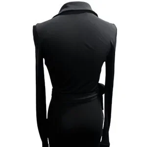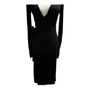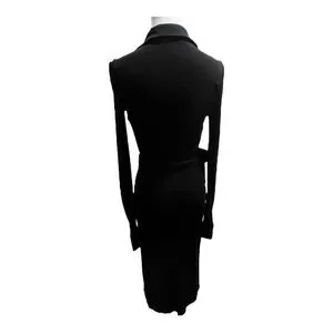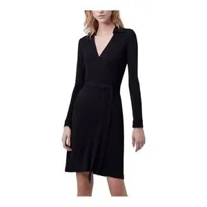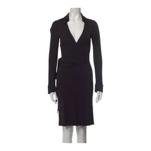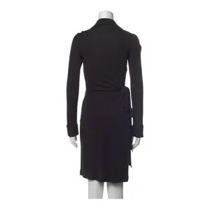 This dress from the house of Diane Von Furstenberg is an excellent piece to flaunt at an evening event. For a luxurious touch, accessorize this black creation with statement jewelry. The crepe dress features a flattering silhouette along with a collared V-neckline, a wrap self-tie detailing, and long sleeves. It is sure to have compliments pouring in!