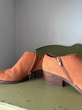 Lucky Brand suede ankle booties in a warm brown. Soles are in great condition, back heels have some scuffing. Very comfortable.