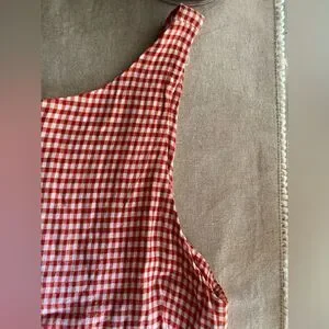 Stylish mini dress with a red and white checkered pattern. Sleeveless design for a modern look. Ideal for casual outings.