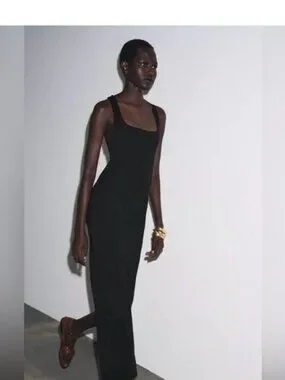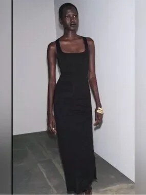 Sleek black maxi dress with a square neckline for a streamlined silhouette. Soft, body-skimming fabric provides comfortable all-day wear. Versatile design that easily dresses up with accessories. Includes black color for timeless wardrobe styling.