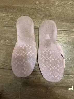 Soft lavender leather slides with knotted upper detail. Cushioned footbed for comfort. Gold-tone hardware accents. Easy slip-on design for everyday wear. Size US 7.5