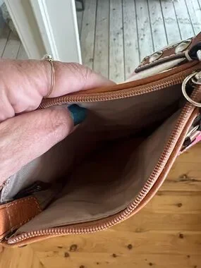Stylish crossbody bag with a multicolor signature print and a contrasting pink shoulder strap. Features a front flap with a secure turn-lock closure and leather trim for polished detail. Lightweight and versatile for everyday use. The pink strap adds a bright, modern accent to the colorful pattern.