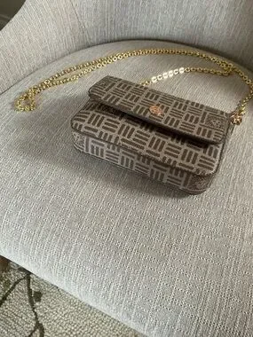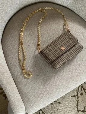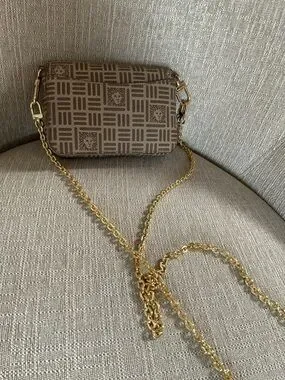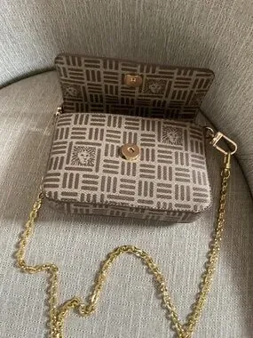 Polyurethane body and gold colour chain. It’s a small purse ,