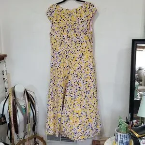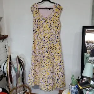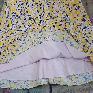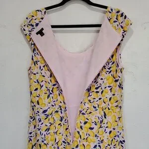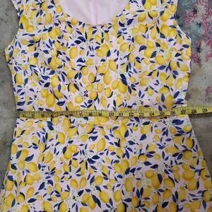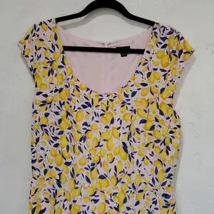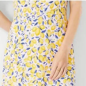 Bright lemon print maxi dress by Ann Taylor. Scoop neckline and cap sleeves. All-over yellow lemons with blue leaf accents. Lightweight, flowy silhouette. Perfect for sunny days and casual outings.