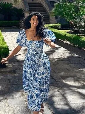 Chic floral midi dress with puff sleeves and a square neckline. Fitted bodice that flows into a gathered skirt. Lightweight fabric with an airy, feminine vibe. Ideal for sunny outings and garden events.