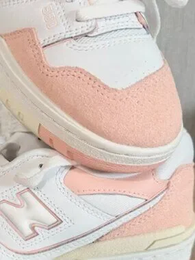 Authentic New Balance 550 sneakers in a clean white and soft pink colorway. A perfect mix of retro basketball style and modern everyday comfort.