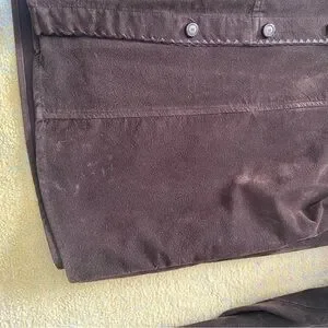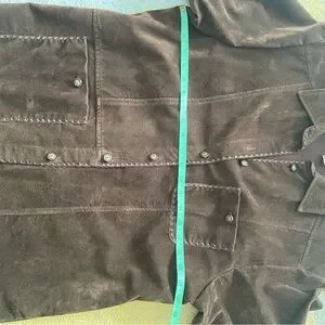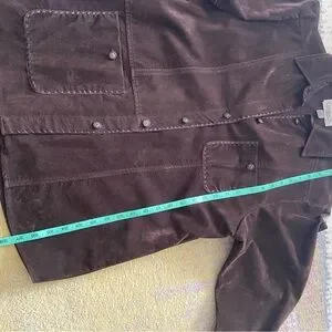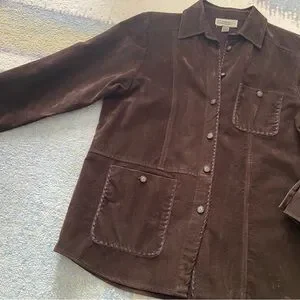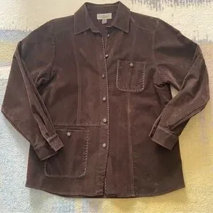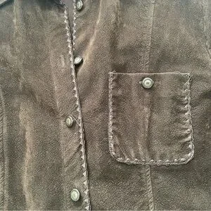Elegant brown suede style jacket with a button-up design. Perfect for layering. Stitching detail around pockets.