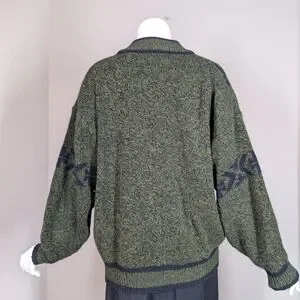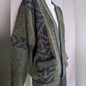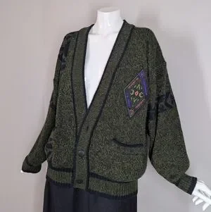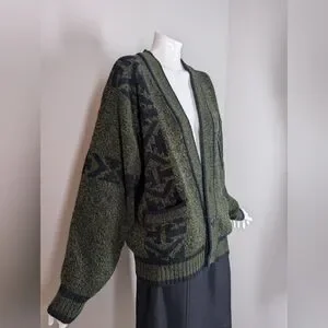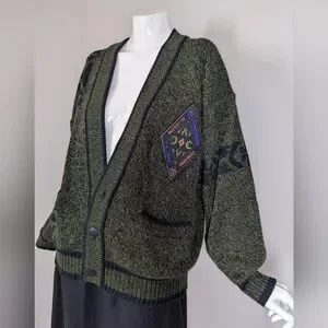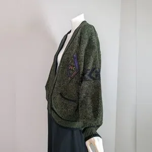 Vintage 80s/90s Graphic Knit Cardigan – Academia Patch – Moss Green Preppy