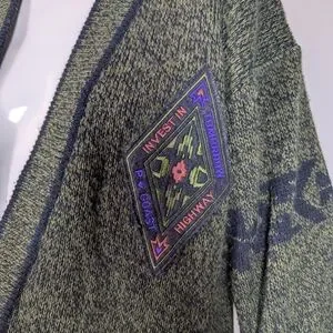 Cozy vintage 80s/90s knit cardigan in a moss green and navy marled knit with a unique embroidered graphic patch that reads “Invest in Tomorrow – B. Coast Highway”. Dropped shoulders and a slouchy, relaxed fit give it that perfect retro, slightly oversized look.