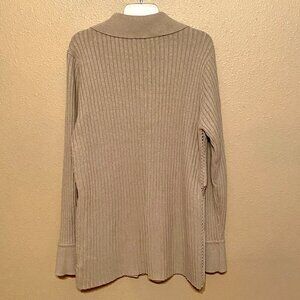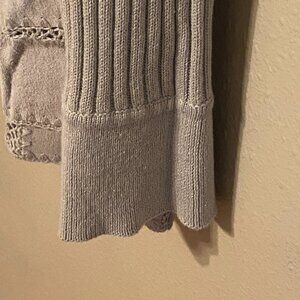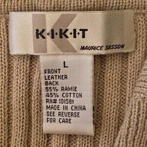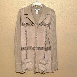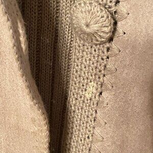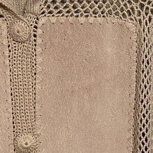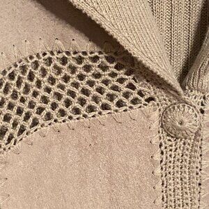 VINTAGE KIKIT Maurice Sasson Women's Suede Leather Jacket Crochet Beige Size (L). Beautiful suede sweater jacket featuring leather fabric blocks crocheted together with a ribbed knit back and sleeves.