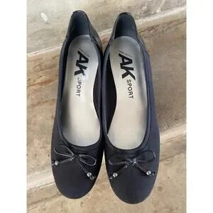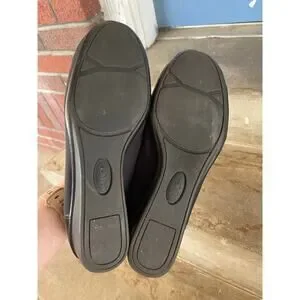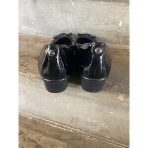 Upper is black neoprene with black patent accents. Wedge heel is 1.5 inches. In excellent condition.
