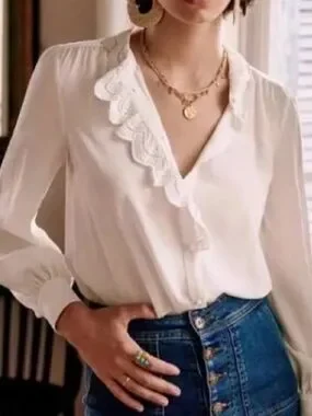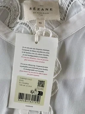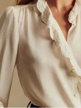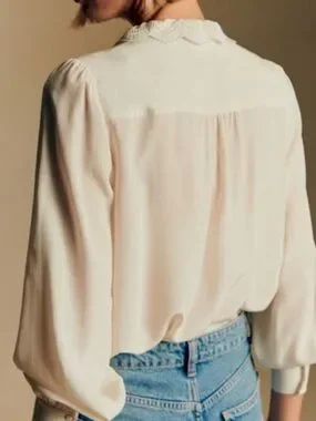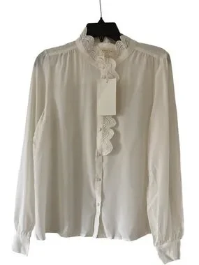 Sezane Chlo Silk Blouse Top NWT Lace Detailing In Ecru Soft White