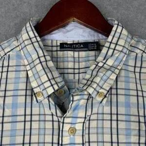 The Nautica Cool Breeze Blue Plaid Shirt is a stylish and versatile addition to any man's wardrobe. Featuring a classic button-up style with a collared neckline, long sleeves, and woven cotton fabric, this shirt is perfect for casual occasions or parties. The blue plaid pattern adds a touch of sophistication, while the shirt's regular fit and size L make it comfortable for everyday wear. With its button accents and convenient pockets, this shirt is ideal for the winter, fall, and spring seasons.