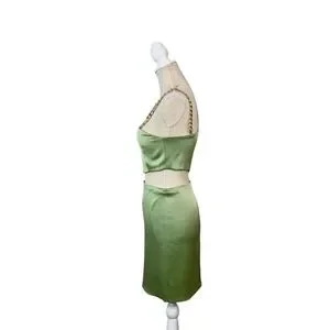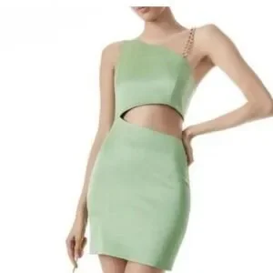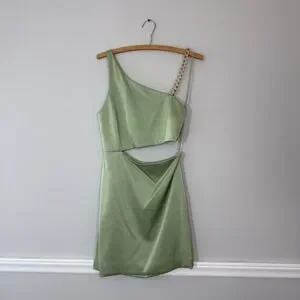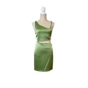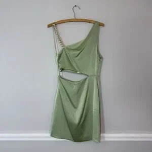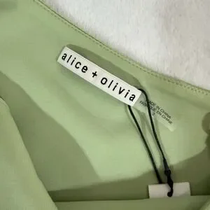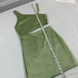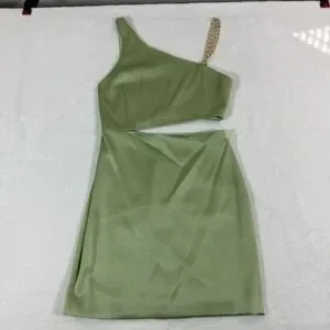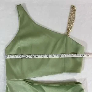 The NWT Alice + Olivia Revolve Women's Green One-Shoulder Cutout Karoline Dress in size 2 is a stylish and elegant gown perfect for weddings, parties, or formal events. Made from a polyester blend chiffon material, this dress features a one-shoulder design with a cutout detail, adding a touch of sophistication to the overall look. With a zipper closure and a mini length, this dress is a popular choice for the seasons of summer, fall, and spring. The dress's green color and chain accents give it a trendy and designer feel, making it a classic piece in any woman's wardrobe.