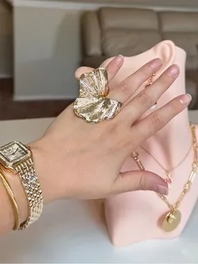 Bold gold floral statement ring crafted for standout style. The gold finish adds warm shine and pairs effortlessly with other jewelry. Designed to be a showpiece for special occasions or everyday glamour.