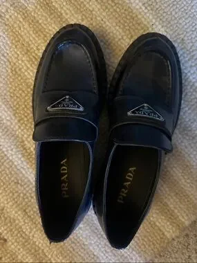 Classic black leather loafers. Metal triangular logo plaque on vamp. Clean, polished finish for dress or smart casual wear. Stitched apron toe and low heel. Like Prada style