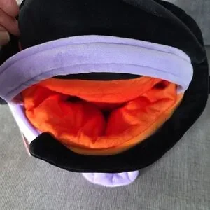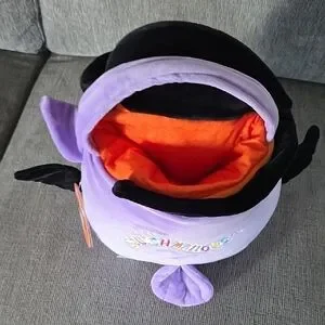 Adorable purple Squishmallow owl, Holly wearing a witch hat. Perfect for Halloween decor or cuddling. This Squishmallow is actually a basket or pail for treats. Orange inner lining, measures 12×8 inches, and so soft! Comes with handle on top. Good for trick or treating and adding to your plush collection. NWT