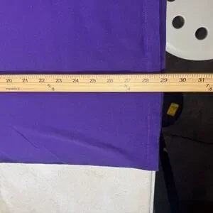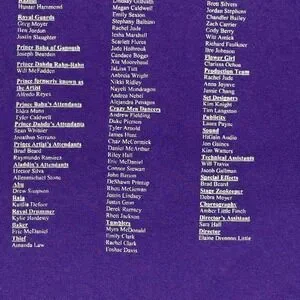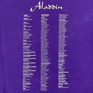 Vintage-inspired purple Aladdin graphic tee features a vibrant front print of Aladdin, Jasmine, and the Genie on the magic carpet. The back of the shirt showcases an extensive cast and crew list, reminiscent of a theater production or special event program. Crafted from 100% pre-shrunk cotton by Anvil, this short-sleeve crewneck offers a comfortable fit with a unique collectible appeal for Disney fans.