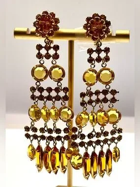Stunning 1980s / 1990s vintage chandelier earrings featuring rich amber-toned glass rhinestones in a dramatic tiered design. These statement earrings have beautiful movement and sparkle, with multiple faceted stones that catch the light from every angle.