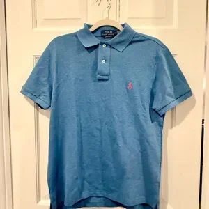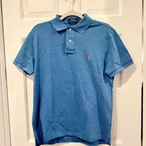 Men’s Ralph Lauren Blue Polo with Pink Logo - Size M Slim Fit