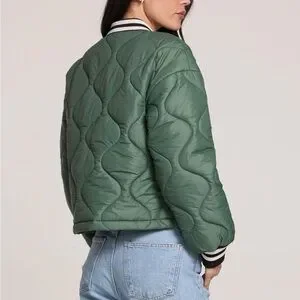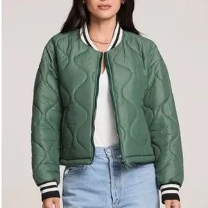 Lightweight quilted bomber from saltwater LUXE. Zip-front closure with ribbed collar and cuffs. Subtle diamond-like quilting for texture. Side welt pockets for function. Relaxed fit for easy layering. Striped cuff.