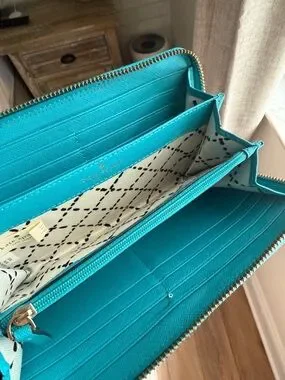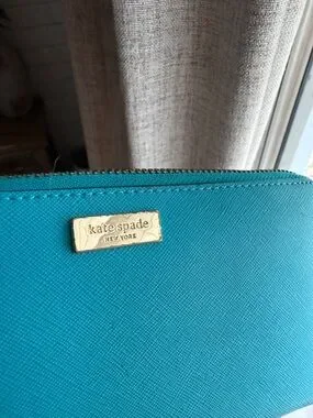 Kate Spade zip-around wallet in a vibrant turquoise blue. Gold logo plaque and zipper hardware. Slim, structured silhouette. Sleek and modern style.