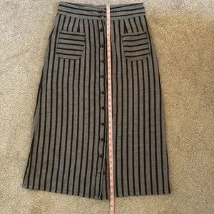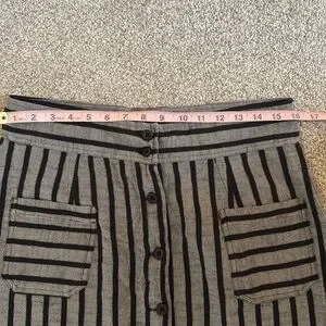 Ace & Jig A-line skirt with vertical black stripes on gray. Front button closure with decorative patch pockets. Clean, classic striped design ideal for day or office wear.