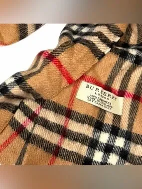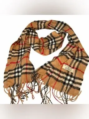 Classic and timeless, this Burberry London scarf features the iconic tan nova check pattern with black, white, and red plaid detailing. Made from 100% cashmere and crafted in England, it offers a luxuriously soft feel while keeping you warm and stylish. Finished with traditional fringe ends for a polished look.