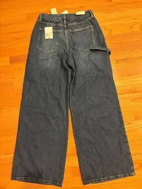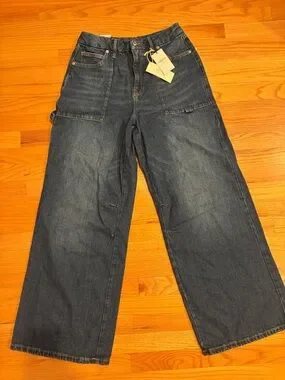 Straight leg women's jeans from Forever 21. Classic dark blue denim with utility-style front pockets. High-waist fit and wide leg silhouette. Easy to style for casual looks.