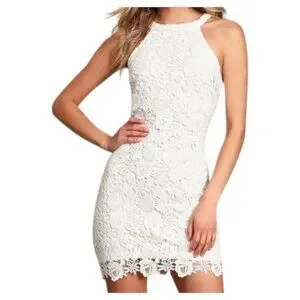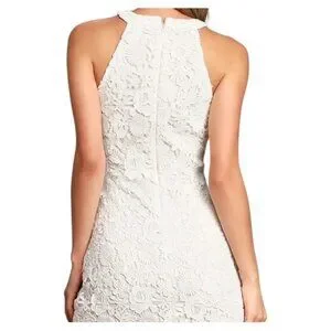 lulus lace dress, ivory lace mini dress, halter lace dress, floral lace dress, sheath mini dress, white party dress, bridal shower dress, engagement party dress, white lace dress, sleeveless lace dress