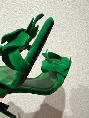 Vibrant green slingback heels with layered floral appliqués on the toe. Slim stiletto heel and open-toe design. Smooth upper with elegant, sculpted flower detail. Bold color for statement looks.