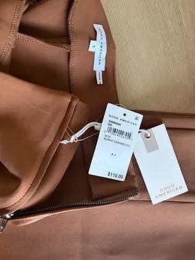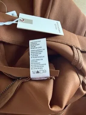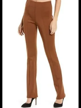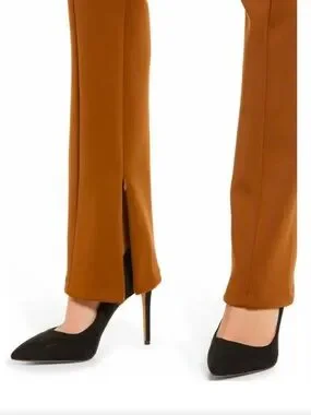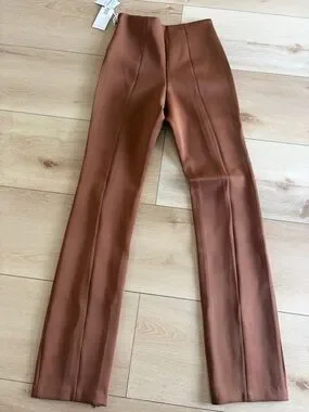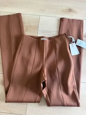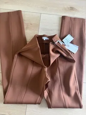 High-rise tailored trousers with clean front seams. Smooth fabric. Zip closure at side for a sleek fit. Warm rust brown versatile for many outfits.