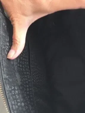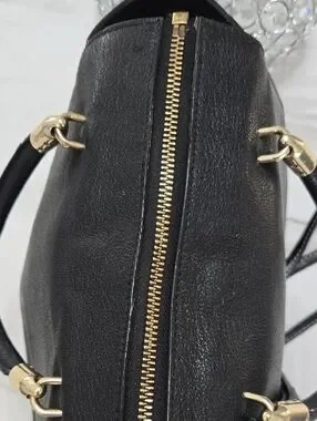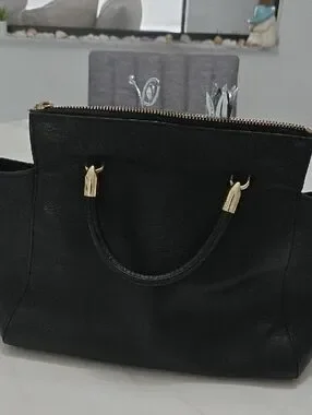 Elegant black leather satchel with gold-tone hardware. Dual top handles and zippered top. Decorative leather tassel accent. Small logo foil on front for subtle branding. Very clean!