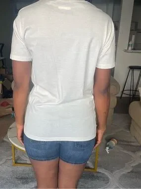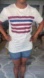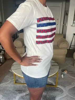Super cute and unique white tee by Aike featuring vibrant African wax print fabric stripes in red and blue — flag-inspired design with a fun cultural twist. Classic crew neck, short sleeves, relaxed fit. Clean white back. Great for summer, 4th of July, or everyday styling.