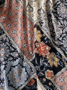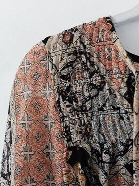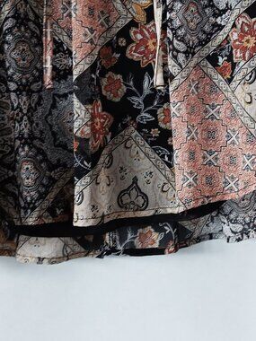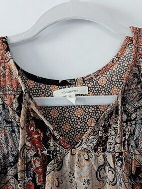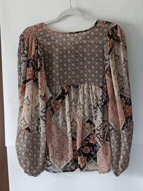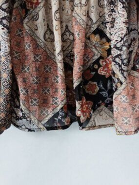 LIKE NEW! This boho-inspired peasant blouse is covered with rich patchwork-style patterns in a multitude of beautiful fall colors, including beige, burnt umber, gold, orange, black, white, and gray. 100% polyester sheer fabric with black interior lining. V-neck collar with 14.5" ties. Long sleeves with elastic cuffs. Relaxed fit; runs large. This is a versatile top that can be dressed up with a black skirt or pants or dressed down with denim. Be sure to check measurements and refer to pics for fabric and garment care info. DISCOUNTED SHIPPING! ALL