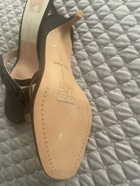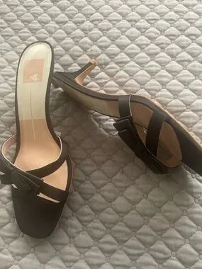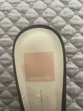 Chic Dolce Vita slides with crossed straps and a subtle bow accent. Easy slip-on mule silhouette. Neutral black pairs with many looks. Low profile for everyday wear.