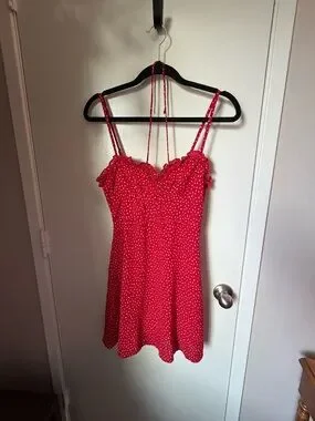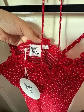 Playful red mini dress with a white micro flower print. Smocked back bodice with ruffled front neckline. Thin spaghetti straps for a flirty look. Lightweight and easy to wear.