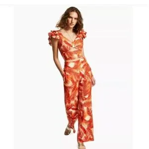 Bold and eye-catching INC International Concepts matching set featuring a tropical palm print in vibrant orange tones. This stylish two-piece outfit includes a ruffled crop top and coordinating high-waisted pants—perfect for vacations, summer outings, or resort wear!