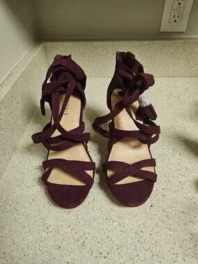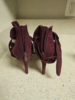 These size 9 WW burgundy platform heels feature a faux suede burgundy lace up closure and back zipper with a tan suede bottom. Please see the pictures for details of the condition.