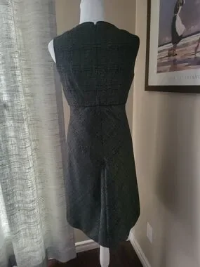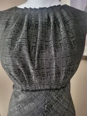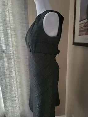 Classic sleeveless fit-and-flare dress in a textured black fabric. Tailored waist and subtle pleating at the neckline create a flattering silhouette. Versatile black dress suitable for work or evening wear. Easy to style with heels or a blazer.