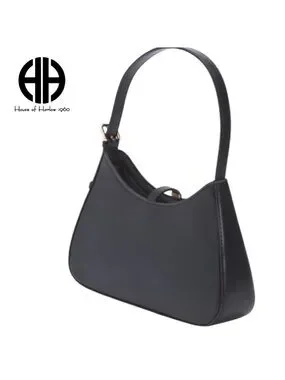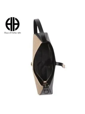 Chic shoulder bag by House of Harlow 1960. Beige woven body with black trim and strap. Gold-tone clasp and logo accent. Structured silhouette with single top handle. Sleek, versatile design for everyday wear. WITH CHERRY CLIP!
