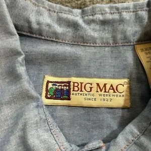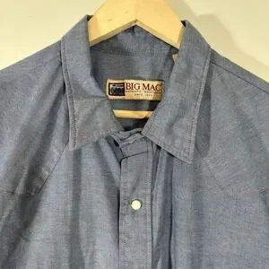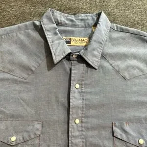 Vintage 90's Big Mac Blue Shirt Chambray Work Wear Pearl Snap Western Men's Size 2XL Big Regular. Made in the USA.