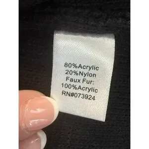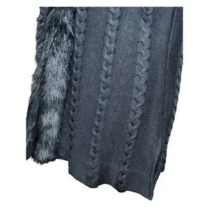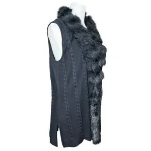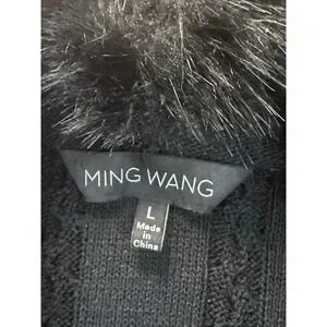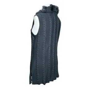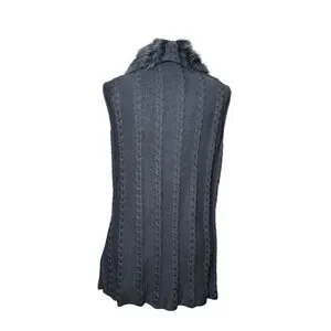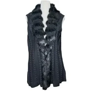 Ming Wang Sweater Vest Women L Black Faux Fur Trim Cable Knit Quiet Luxury Chic