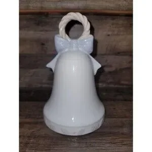 White Porcelain Christmas Musical Bell With Christmas Tree And Blue Bow 6 inch