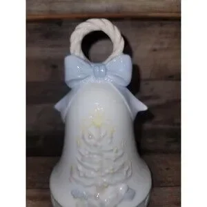 Beautiful Vintage musical christmas bell. Plays Silver Bells. Stands 6 inches tall. Perfect condition. Can sit or hang. Features a christmas tree and a blue bow.