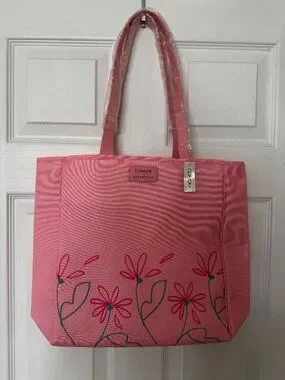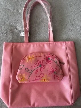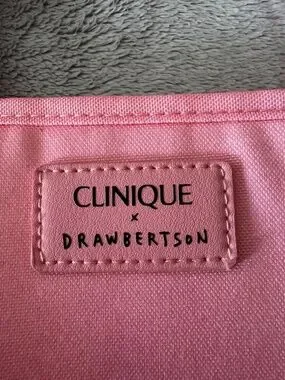 Clinique Pink Tote Bag and Cosmetic Bag set Drawbertson Flower Design NWT
